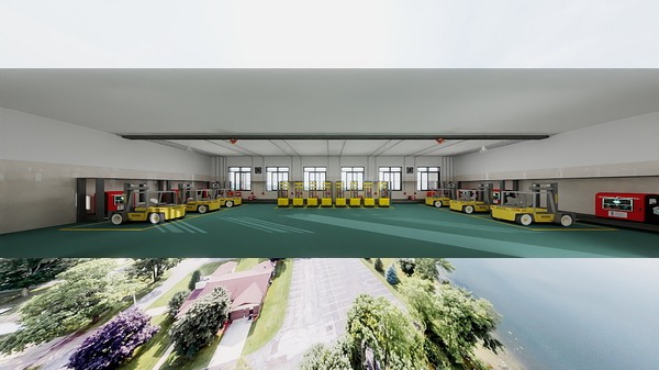 设计说明:为保障叉车设施的高效充电需求,在南、西、北三个方位分别安装专用支架,并在钢板上铺设绝缘毯,用以规范摆放充电设施,确保充电作业安全有序进行。